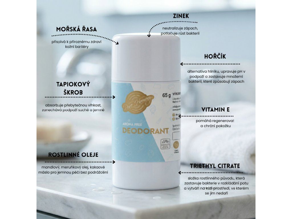 AROMA free deodorant 65 g bez parfemace účinně chrání proti zápachu, aniž by blokoval pocení. Kombinace absorpčních a antibakteriálních složek udržuje podpaží svěží a suché po celý den, zatímco pečující rostlinné oleje podporují komfort a zdraví pokožky. Dermatologicky testováno i pro citlivou pokožku.