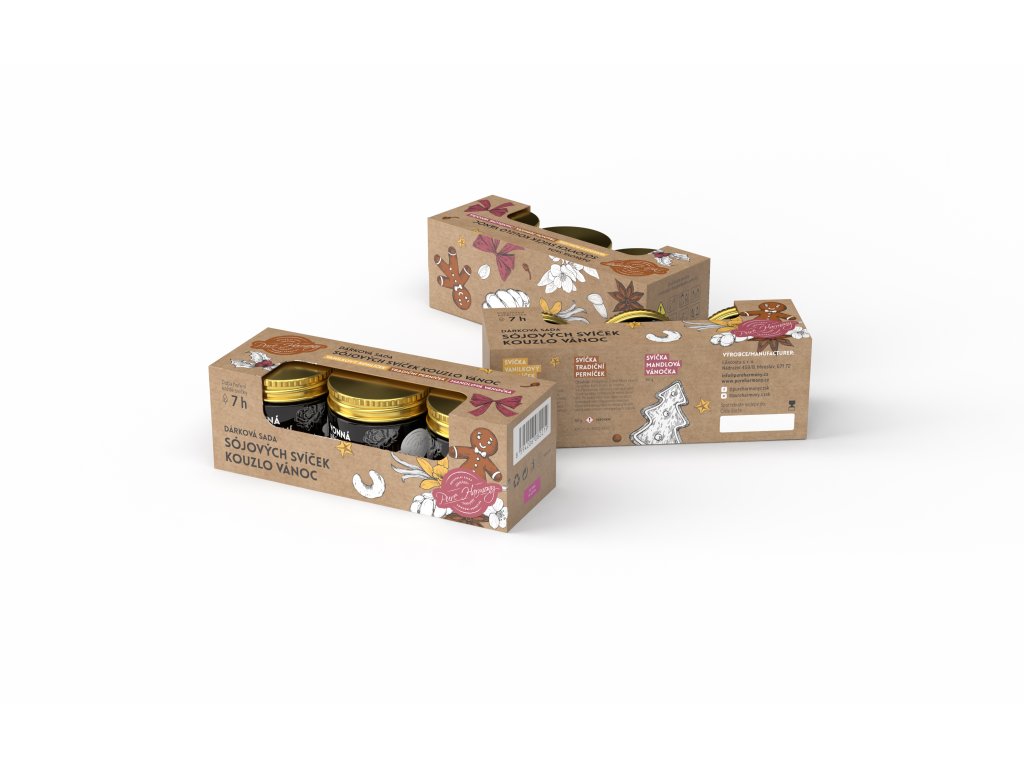 Potěšte sebe nebo své blízké s dárkovou sadou tří přírodních sójových svíček Pure Harmony, která obsahuje: Vanilkový rohlíček, Tradiční perníček a Mandlová vánočka. Každá svíčka o hmotnosti 50 g je vyrobena ze 100% sójového vosku s bavlněným knotem, veganská a bez parafínu.