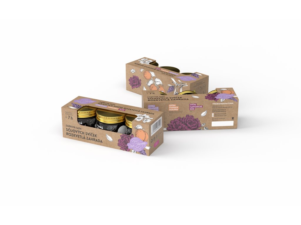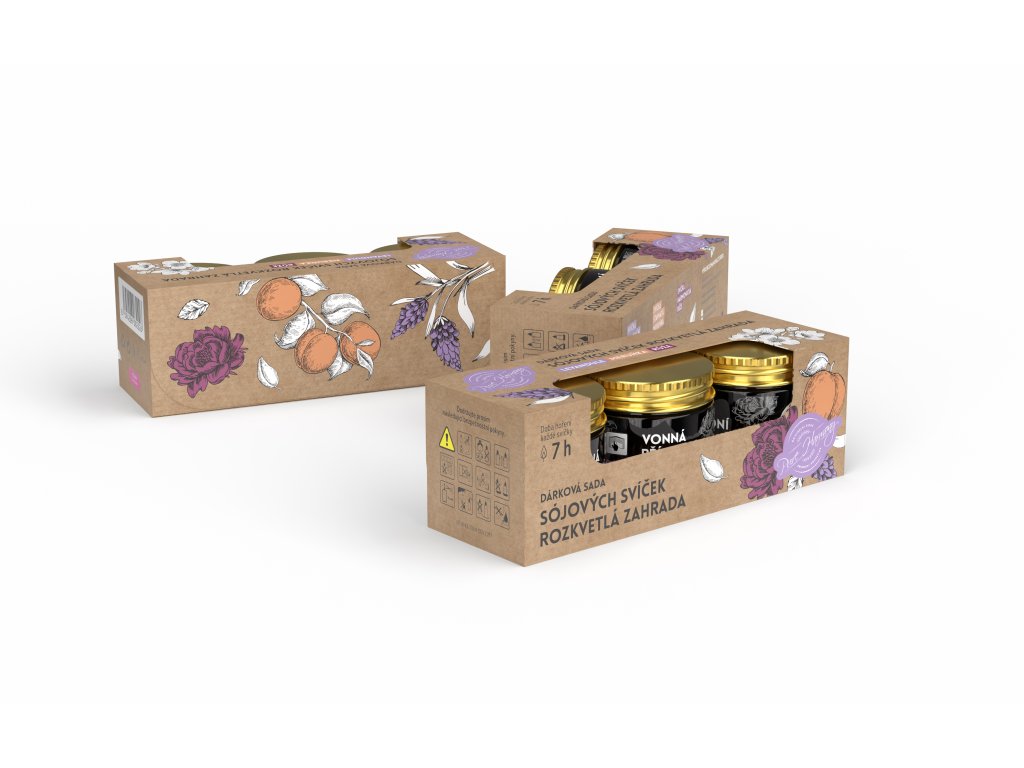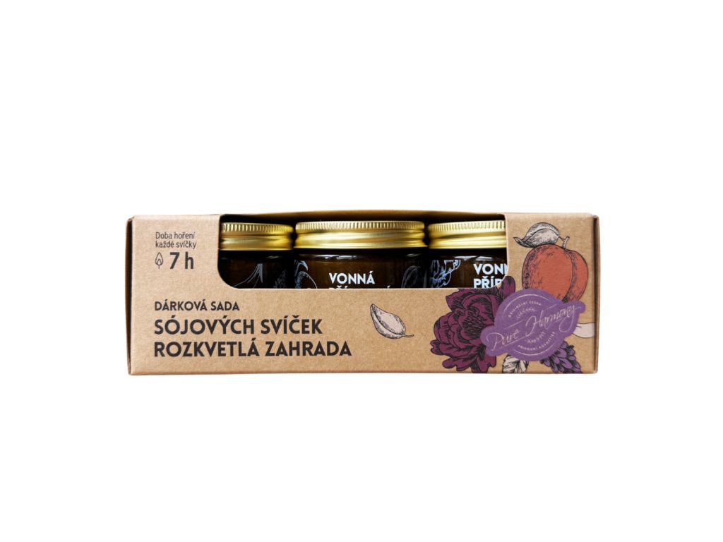 Přineste do svého domova vůni květin s dárkovou sadou sójových svíček Rozkvetlá zahrada. Obsahuje svíčky Relaxační levandule, Šťavnatá meruňka a Harmonická růže, každou o hmotnosti 50 g. Svíčky jsou vyrobené ze 100% sójového vosku s bavlněným knotem a vydrží hořet asi 7 hodin.