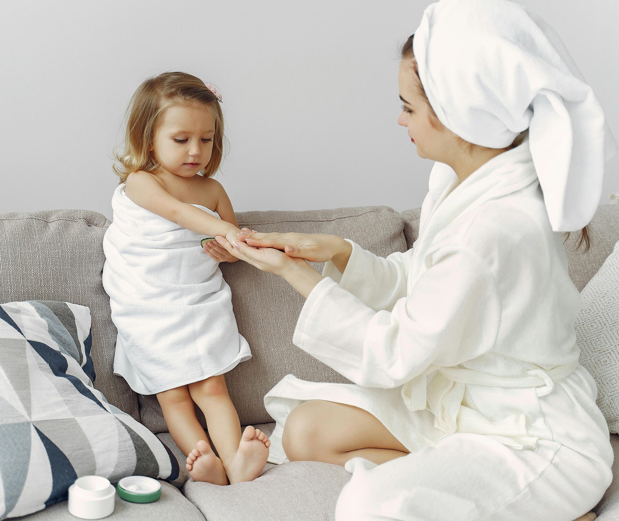 2.🧴Hydratace: Po koupeli naneste tenkou vrstvu emoliencia, aby se pokožka chránila před vysycháním. Volte přípravky bez silných parfémů a s jednoduchým složením; při ekzému se řiďte radami pediatra/dermatologa.